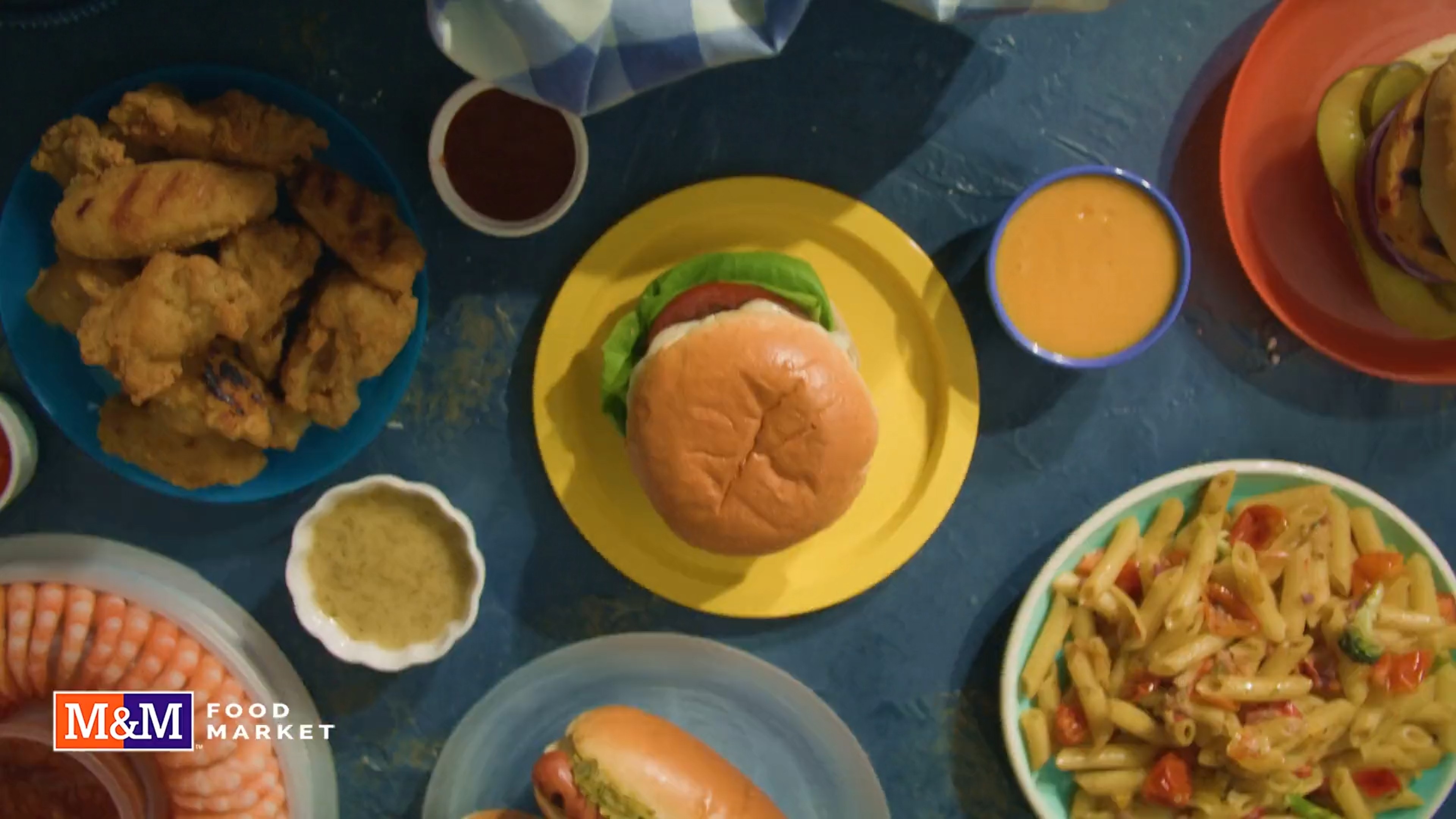 We built the piece around vibrant food styling and bold color contrast — warm oranges, saturated blues, and golden highlights that make every plate pop. The cinematography leaned into playful overheads and tight macro shots that capture textures: the gloss of the sauce, the crisp of fried chicken, and the melt of cheese over a burger.